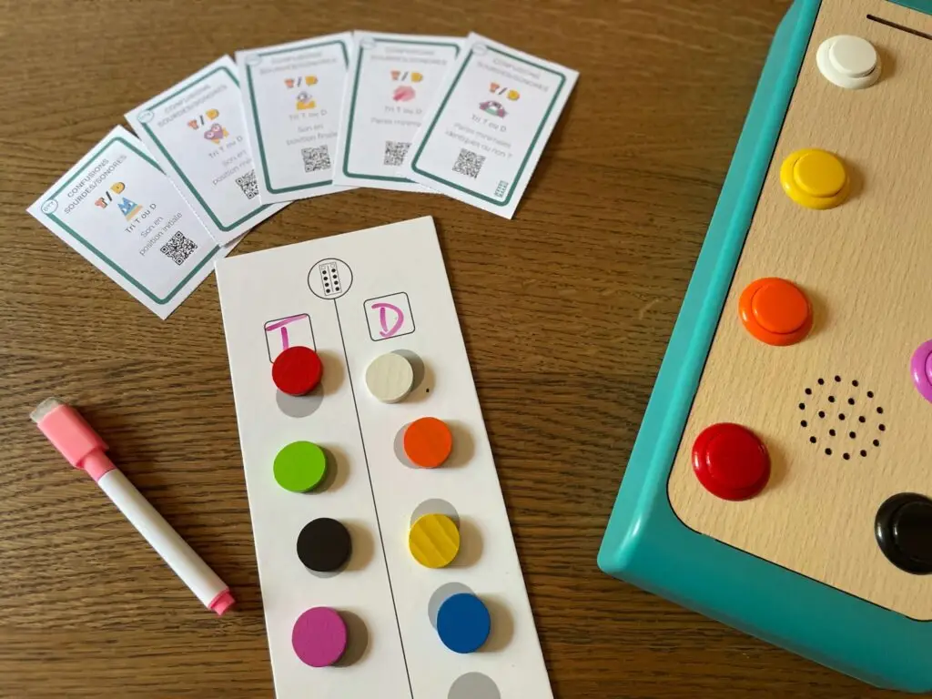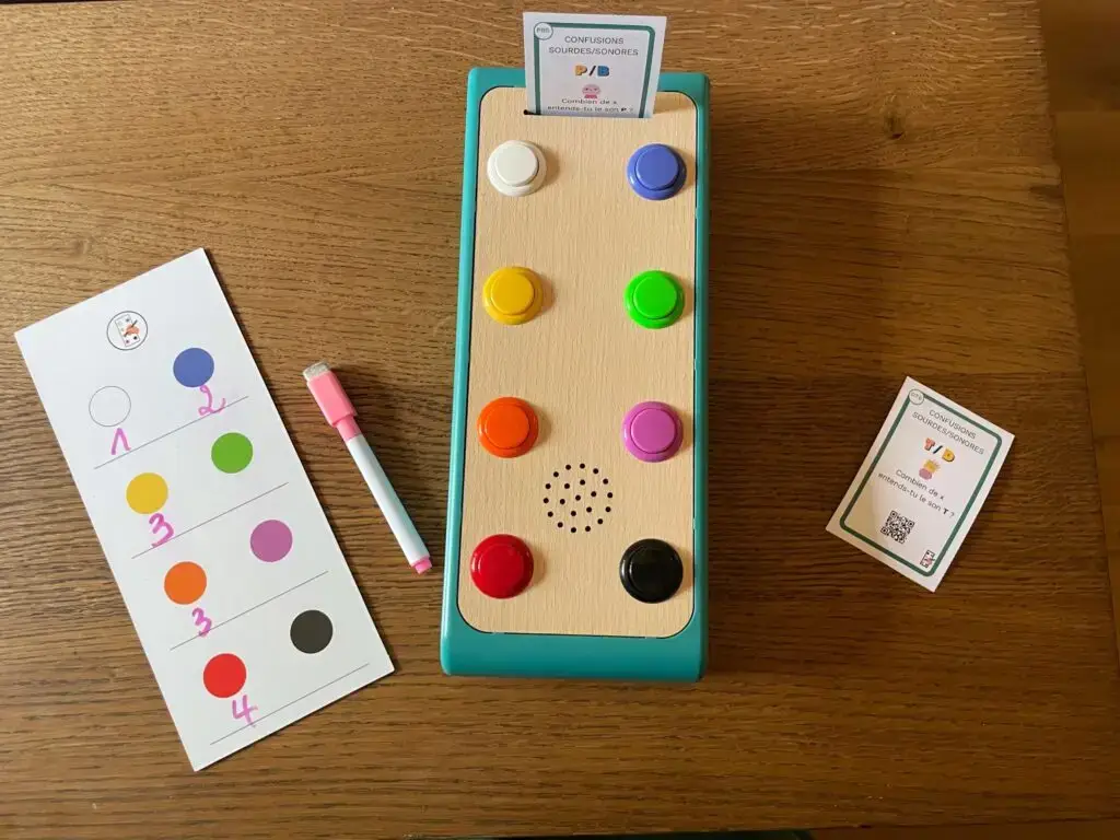 L’enfant écoute attentivement la phrase et compte le nombre de fois où il entend le son cible. Il note sa réponse sur la planche colorée et passe au bouton suivant.